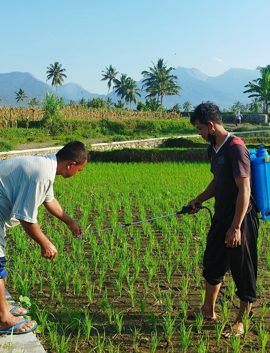 Petani Desa Karang Baru Lakukan Perawatan Tanaman Padi Musim Tanam Pertama Tahun IniKarang Baru — Dua orang petani tenga...